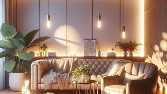 Alanya Mahmutlar Psikolojik Danışman therapy room setup with comfortable seating and warm lighting.